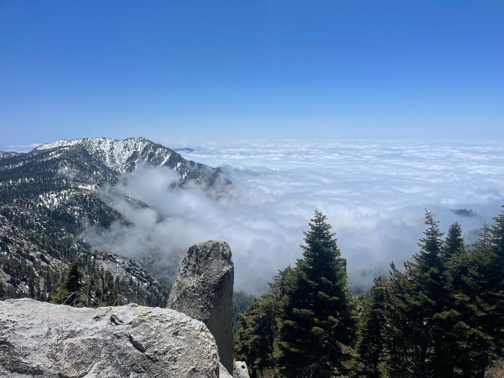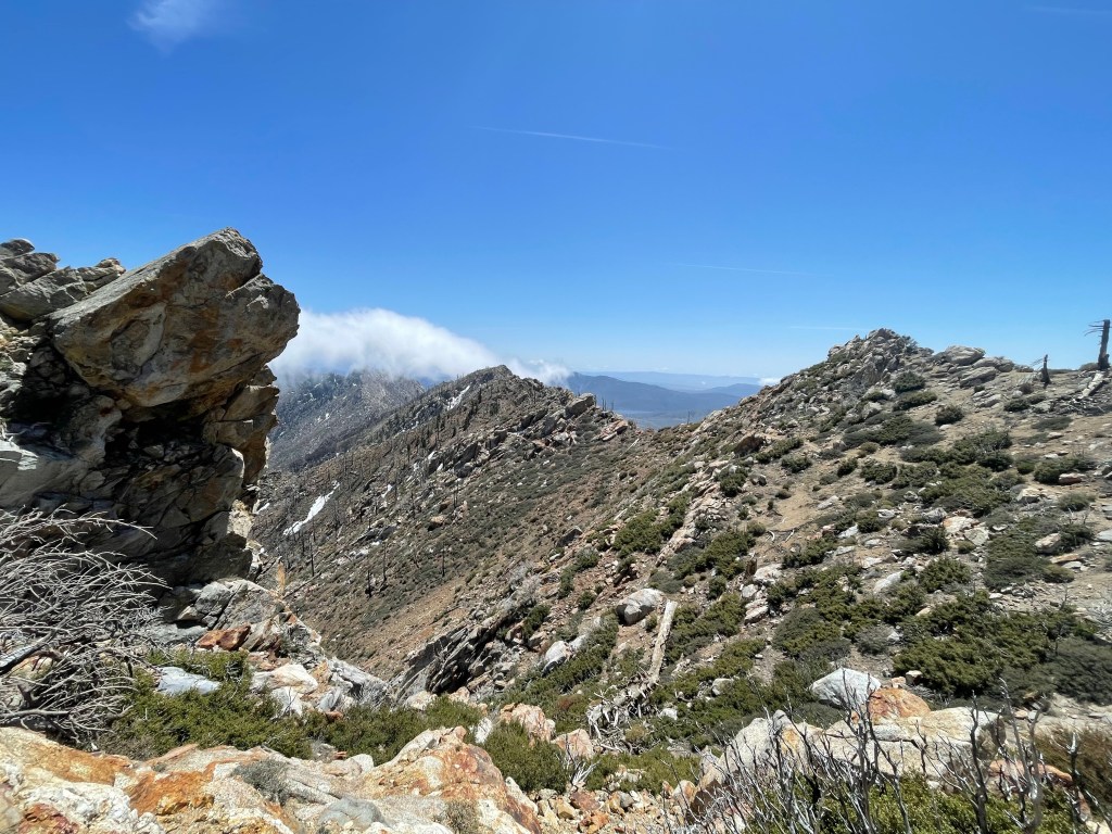At this point, we had gotten to an elevation we’re snow patches started popping up. It wasn’t bad until we got closer to San Jacinto. Our first encounter with snow was a fairy tame walk through snow fields. Not difficult or dangerous, but just slow moving. Unfortunately, at one point I slipped and had a minor fall which caused one of my hiking poles to snap in half, making snow travel on the rest of this stretch more difficult. That night we found a dry spot to camp, but we ended up getting snowed on that night.