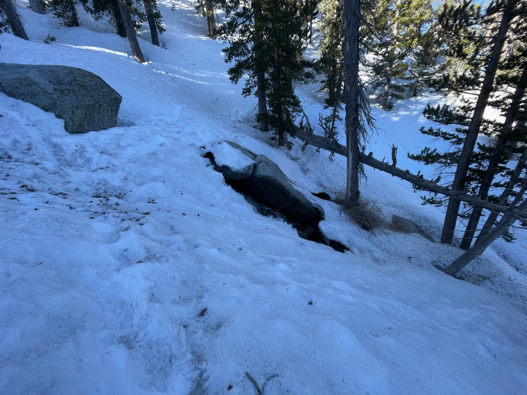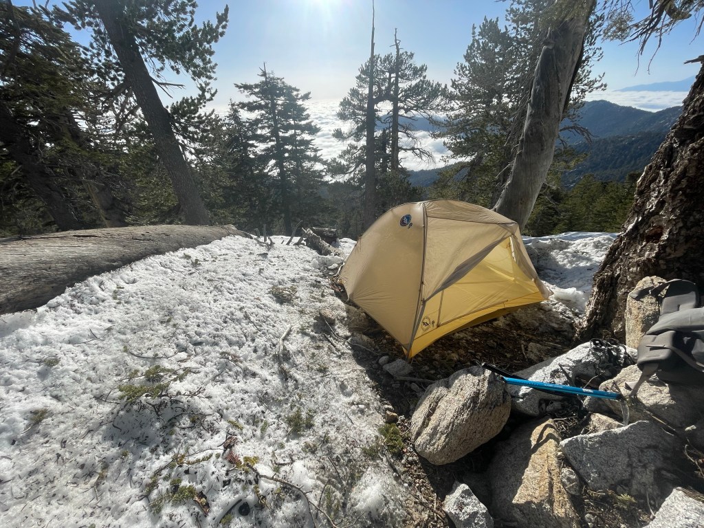 The next day was full of snow. For most of the day the snow was just an annoyance as we hiked around Mount San Jacinto. At the end of the day, we began an infamous section known as Fuller Ridge. This stretch of trail traverses a ridge line pretty much covered in snow, at time pretty exposed with steep slopes. As we hit this at the end of the day, the snow had become slushy making it much easier to slip even with the appropriate gear (i.e. micro spikes and ice axes). Due to this condition, we made the call to set up camp immediately on the slope and resume once the snow was crunchy again in the morning. Crunchy, frozen snow is much faster and safer to traverse than slush. Unfortunate, this meant we had to share a tent on an extremely sloped, rocky terrain, resulting in a bad night’s sleep. When hitting the trail again the next morning, snow travel was much easier until the afternoon once we hit slushy snow again.